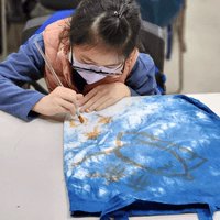 孩子每天走一段古道,帶著古道上見證的、人與自然互動的故事,帶著地、水、火、風的滋養,回到農場,動起手腳工作。他們煮自己的午餐,協助收成段木香菇、山藥零餘子,榨薯榔汁液作染布顏料,學習藍染;最後,用自己採集植物,為自己的袋子染上顏色。他們用身體,用靈魂,經驗到「青出於藍,勝於藍」。